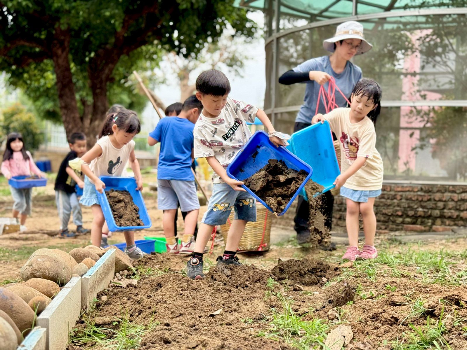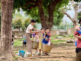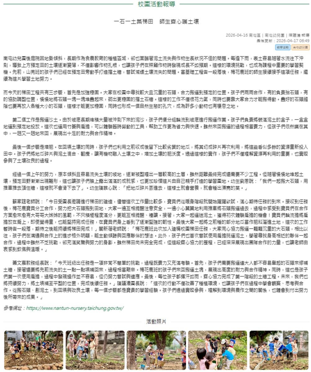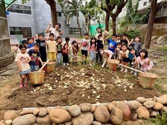 蘇家誼老師說:「今日受園長邀請進行梯田的建造,儘管這次工作量比較多,寶貝們從暖身階段就開始躍躍欲試,滿心期待任務的到來。接收到任務後,梅花鹿寶貝分工合作,努力把大石頭搬到田地,大家一邊互相提醒注意安全,一邊小心翼翼地利用推車將石頭搬運過去,過程中感受到寶貝們在合作方面愈來愈有大哥哥大姊姊的風範,不只積極程度滿分,更能互相提醒、禮讓。接著,大家一起運送泥土,獲得初次體驗扁擔的機會!寶貝們輪流擔將扁擔放在肩上,即使覺得重,也能堅持完成任務,在寶貝們身上看到了逐漸堅強的韌性。最後大家一起將之前種的部分地瓜當作肥料灑進土地,這次的工作暫時告一段落,期待之後能持續將梯田完成!」關新蓓老師說:「梅花鹿班此次加入建構校園梯田任務,大家同心協力搬運一顆顆沉重的大石頭,相比以往,孩子們在溝通與合作上的進步格外明顯,能主動傾聽與回應夥伴的想法。此外,孩子們也首次嘗試使用扁擔挑運泥土,學著尋找身高相近的夥伴一起合作,過程中雖然不乏挑戰,卻充滿笑聲與努力的身影。雖然梯田尚未完全完成,但這段齊心協力的歷程,已經深深展現出團隊合作的力量,也讓老師由衷感到欽佩與溫暖。」