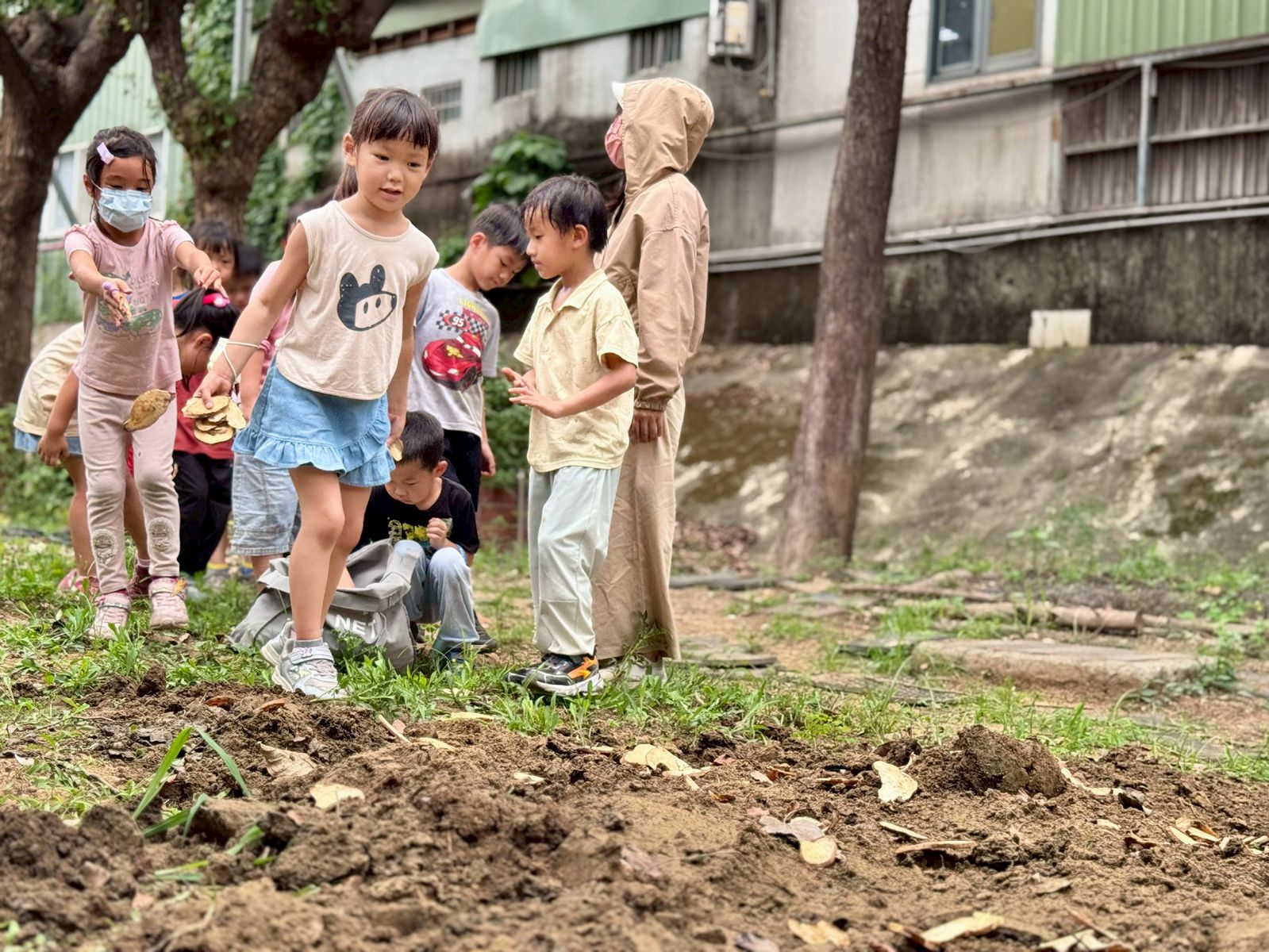 南屯幼兒園後庭院因地勢傾斜,長期作為食農教育的種植區域,卻也面臨著泥土流失與作物生長狀況不佳的問題。每逢下雨,表土容易隨著水流往下沖刷,導致上方預定田的土壤逐漸變薄,不僅影響作物扎根,也讓孩子們在照顧作物時發現成長不如預期。這樣的環境挑戰,也成為課程中重要的學習契機。先前,山羌班的孩子們已經在預定田旁動手打造擋土牆,嘗試減緩土壤流失的問題。當基礎工程告一段落後,梅花鹿班的師生接續接手這項任務,繼續為這片學習土地努力。