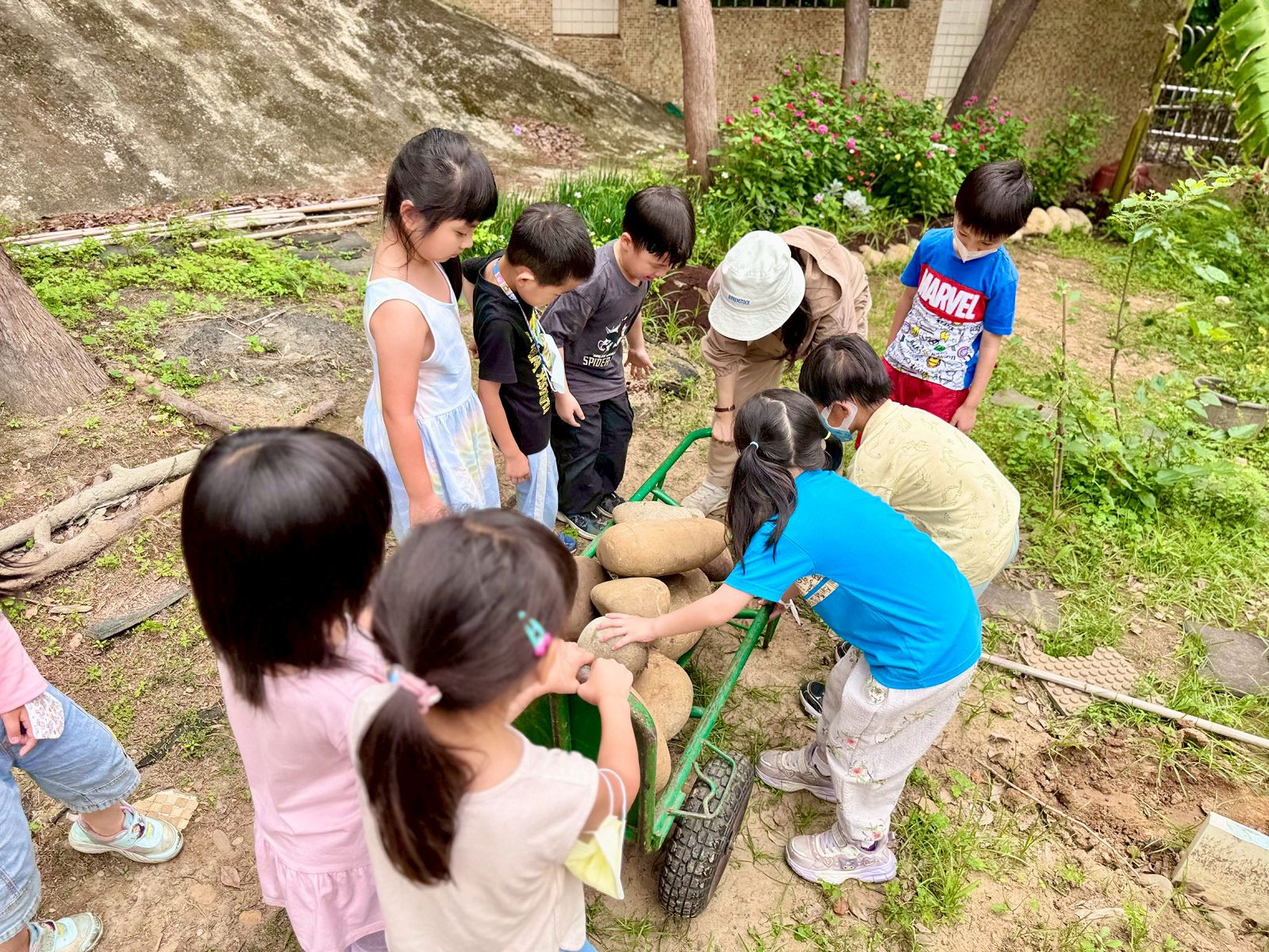 經過一個上午的努力,原本傾斜且容易流失土壤的坡地,逐漸被整理出一層較高的土層,雖然距離最終完成還需要不少工程。但隨著慢慢地堆起土壤,預定田野漸漸出現雛形,這也讓孩子們臉上露出滿滿的成就感,也更加珍惜這片由自己親手打造的學習園地。幼生劉恩說:「我們一起搬大石頭,用推車推去頂住牆,這樣就不會滑下去了」。幼生陳慕心說:「把地瓜碎片丟進去,這樣土就會營養,就會種出漂亮的菜。」