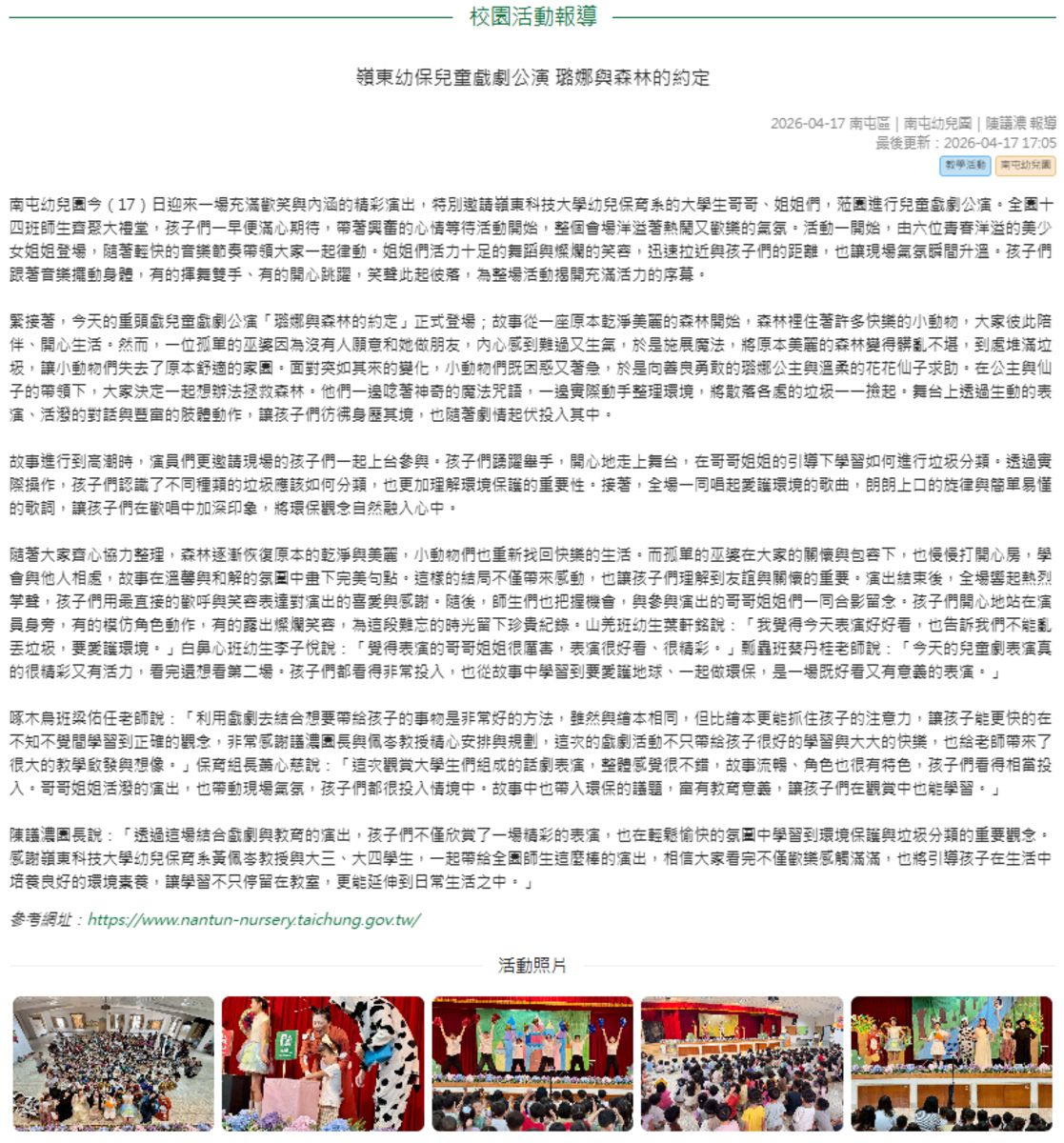 陳議濃園長說:「透過這場結合戲劇與教育的演出,孩子們不僅欣賞了一場精彩的表演,也在輕鬆愉快的氛圍中學習到環境保護與垃圾分類的重要觀念。感謝嶺東科技大學幼兒保育系黃佩岑教授與大三、大四學生,一起帶給全園師生這麼棒的演出,相信大家看完不僅歡樂感觸滿滿,也將引導孩子在生活中培養良好的環境素養,讓學習不只停留在教室,更能延伸到日常生活之中。」