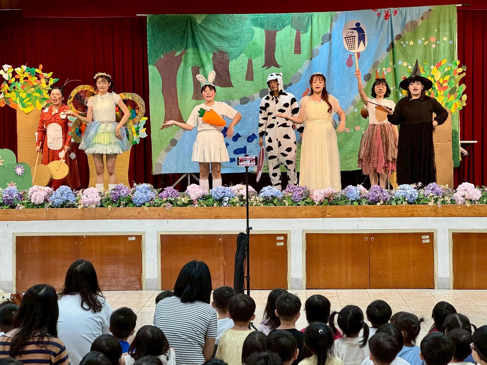 緊接著,今天的重頭戲兒童戲劇公演「璐娜與森林的約定」正式登場;故事從一座原本乾淨美麗的森林開始,森林裡住著許多快樂的小動物,大家彼此陪伴、開心生活。然而,一位孤單的巫婆因為沒有人願意和她做朋友,內心感到難過又生氣,於是施展魔法,將原本美麗的森林變得髒亂不堪,到處堆滿垃圾,讓小動物們失去了原本舒適的家園。面對突如其來的變化,小動物們既困惑又著急,於是向善良勇敢的璐娜公主與溫柔的花花仙子求助。在公主與仙子的帶領下,大家決定一起想辦法拯救森林。他們一邊唸著神奇的魔法咒語,一邊實際動手整理環境,將散落各處的垃圾一一撿起。舞台上透過生動的表演、活潑的對話與豐富的肢體動作,讓孩子們彷彿身歷其境,也隨著劇情起伏投入其中。