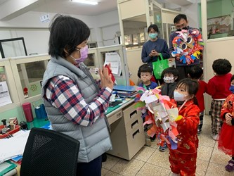 有趣的是,水獺班就這樣拎著年獸頭,每一班逐一去拜年與表演。而且還應景地獻上一首新年歌,向各班師生、行政老師們一一拜年,祝福大家新年快樂、平安健康。園長與行政老師也回禮紅包袋,感謝水獺班為大家帶來喜氣。大家都超喜歡這一對可愛又討喜的年獸,拜年的歡愉氣氛與笑聲,也隨著水獺班遊行而迴盪整個校園。