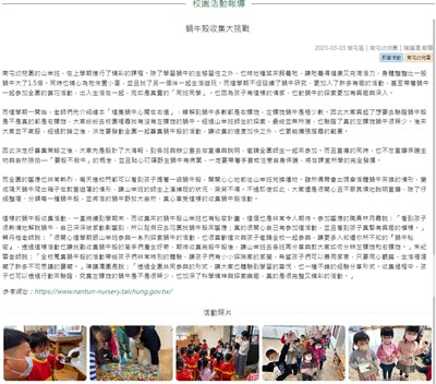 南屯幼兒園的山羊班,在上學期進行了精彩的課程。除了學習蝸牛的生態習性之外,也特地種菜來飼養牠,讓牠養得健康又充滿活力,身體整整比一般蝸牛大了1.5倍。同時也精心為牠佈置小窩,並且找了另一個伴一起生活遊玩。而這學期不但延續了蝸牛研究,更加入了許多有趣的活動,甚至帶著蝸牛一起參加全園的賞花活動,出入生活在一起,宛如是真實的「同班同學」。也因為孩子有這樣的情感,也對蝸牛的探索更加有興趣與深入。