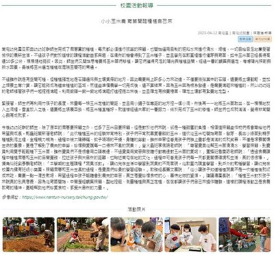 南屯幼兒園日前由幼幼班群師生完成了麻薏圃的種植,每天都必須進行拔草的照顧,也開始運用自制的肥料水來進行澆水、培植,一切自給自足地享受著愉快的農耕生活。不過孩子們對於這樣的課程活動益感興趣,在偶然的機會得到了玉米種子,並且事先在教室裡進行催芽與育苗,如今玉米苗已經長得高達10多公分,棵棵健壯挺拔。因此,師生們又開始思考要將玉米苗們移植,讓它們獲得充足的陽光與種植空間。經過一番的觀察與選定,考慮陽光照射與排水因素,最後將玉米選定種植在庭院玉蘭花的周邊。