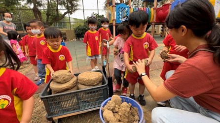 南屯幼兒園的食農課程目前正是全園萌發階段,不僅各班級都擁有自己的種植計畫,師生一起討論、共同執行。而且每個活動都環環相扣,不僅事先準備,也讓一個活動有多段的延伸發展。正如小班之前規劃校外教學前往清水區挖紅土地瓜,單單一個活動引起了焢窯的發想。但實現焢窯願望,首先得克服學校環境並沒有稻梗土的條件,因此在挖地瓜之前,便先利用美植袋裝土曬太陽,用人工製土塊的方式,預先做了一批窯土。所以在上週採完地瓜帶回學校之後,今日(27日)也要來準備進行焢窯,品嚐最具土味的烤地瓜。