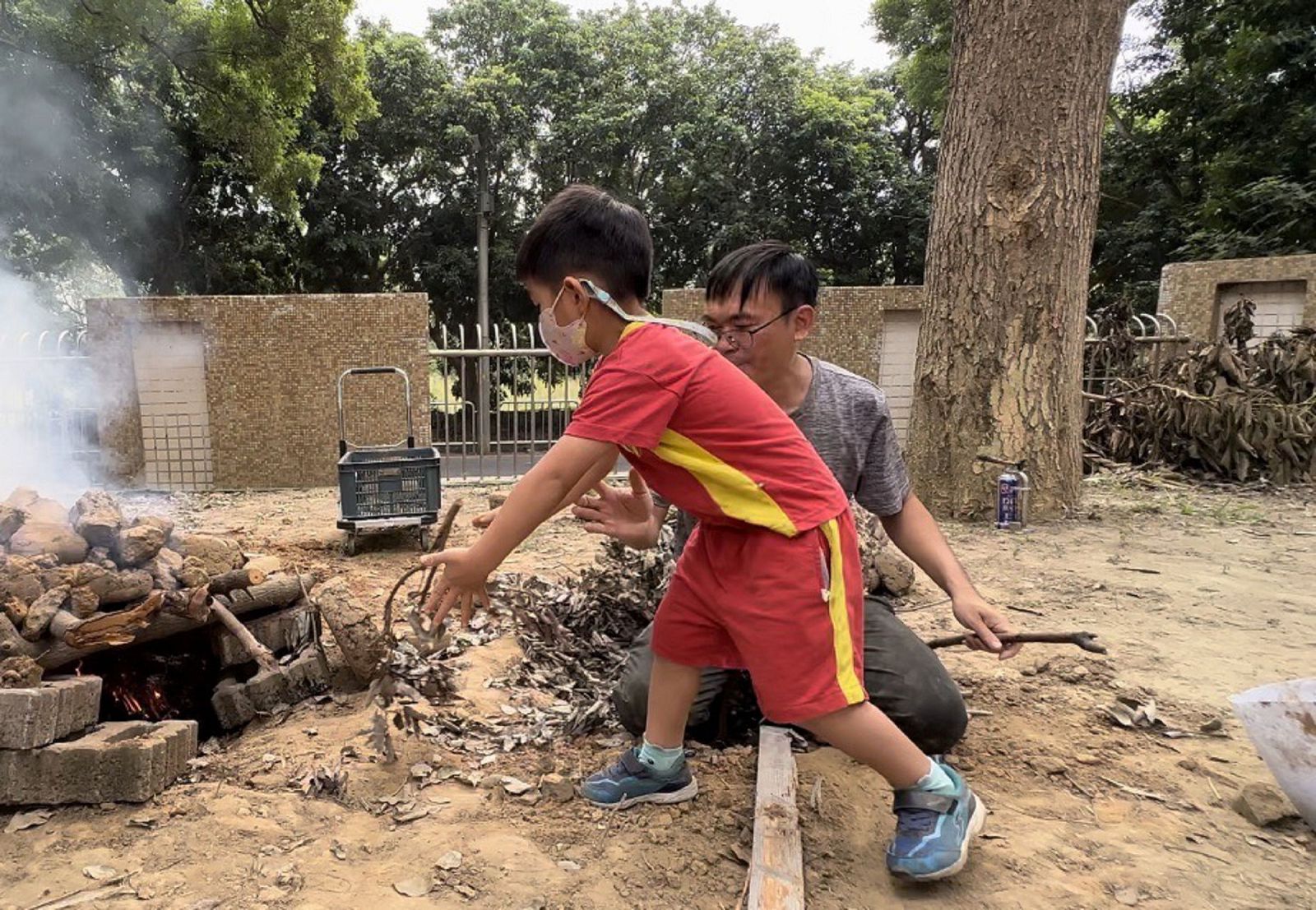 所以焢窯一開始,孩子們先到曬土場先將窯土搬運到窯穴附近,並且利用鋸子鋸出痕跡後,再將土塊分解適當大小。孩子們在老師協助下自己操作,很快就得到許多窯土。之後再將這些窯土放上窯洞上,並在中層架上樹枝來穩固結構,逐步一塊塊疊上窯土,最後完成整個烤窯。完成之後,就是要開始收集燃材,利用這些落在庭院的樹枝落葉放入窯洞裡,然後再點火燃起窯火。孩子看到窯火升起時,大家都忍不住驚喜與歡笑,同時大家也開始輪流增添木材與幫忙煽風,幫助烤窯溫度能不斷提高,為窯土塊增加更高溫度。