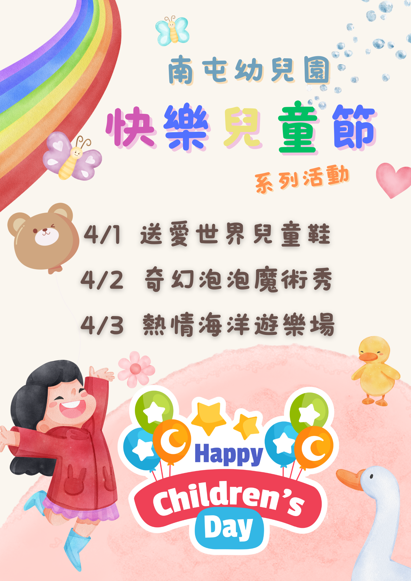 南屯幼兒園兒童節系列活動 快樂兒童節系列活動 下週正式歡樂登場! 一起迎接獨一無二的南屯幼兒園兒童節 4/1 送愛世界兒童鞋 感謝大家這段時間的響應募集 一起將愛心送往需要的孩子與人們 願世界每位孩子都有幸福的兒童節(鞋) 4/2 奇幻泡泡魔術秀 精彩驚奇魔術表演 千變萬化的泡泡秀 絕對娛樂的奇幻饗宴 4/3 奇幻泡泡魔術秀 夏日草原的大冒險 海洋主題的遊戲世界 挑戰刺激的歡樂城堡