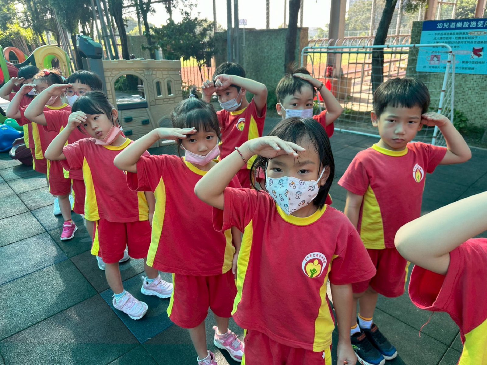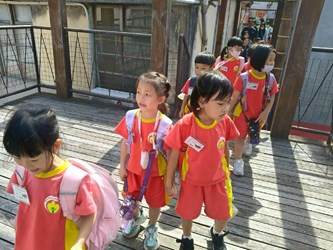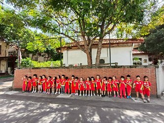 我們跟紅磚牆合照