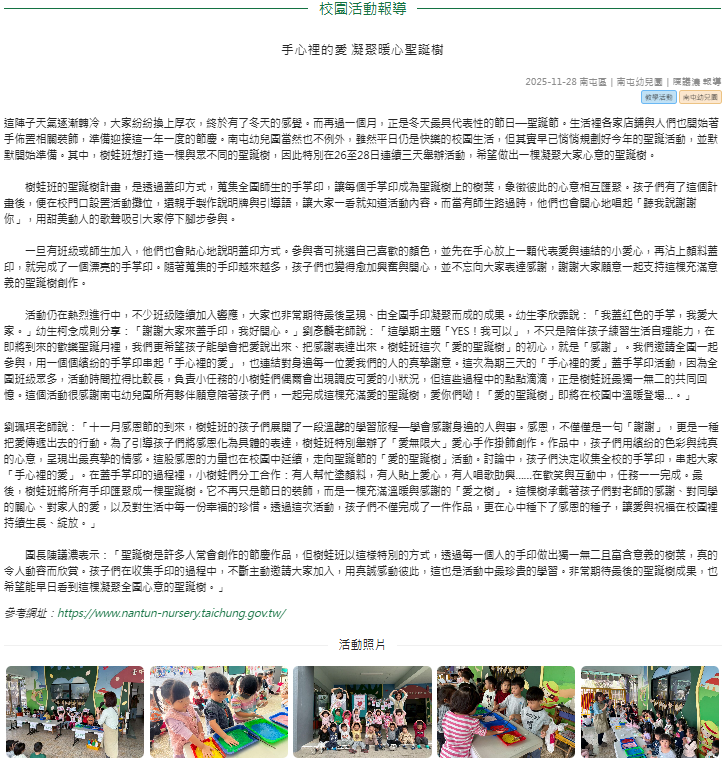 園長陳議濃表示:「聖誕樹是許多人常會創作的節慶作品,但樹蛙班以這樣特別的方式,透過每一個人的手印做出獨一無二且富含意義的樹葉,真的令人動容而欣賞。孩子們在收集手印的過程中,不斷主動邀請大家加入,用真誠感動彼此,這也是活動中最珍貴的學習。非常期待最後的聖誕樹成果,也希望能早日看到這棵凝聚全園心意的聖誕樹。」