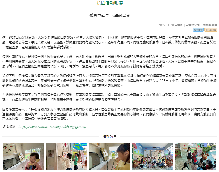 短短不到一個禮拜,進入電話亭錄音的人數便超過了上百人,總錄音時長更達到了整整30分鐘,這個熱烈的迴響讓大家非常驚訝。原來在眾人心中,有這麼多感謝的話語渴望表達;無論對象是誰,孩子們都真摯地將心中的感激之情娓娓道來。而這些錄音,已於今天(28日)中午用餐時播放,全校師生們聽到這些真誠的感謝話語,都格外感到溫馨與感動,一致認為這是個非常特別的感恩節。