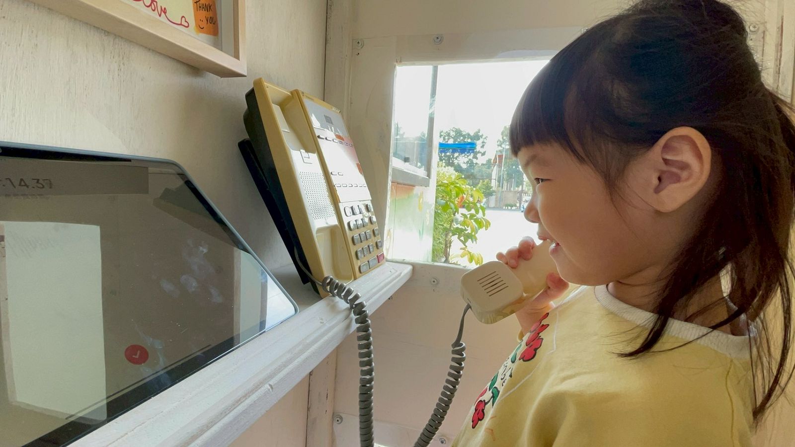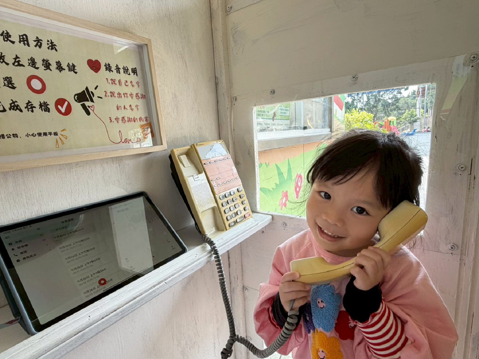 這個計畫的核心,是打造一個「感恩電話亭」,讓所有人能透過平板錄音,記錄下想對感謝的人事物訴說的心意。這些充滿情感的話語,將在感恩節當天中午用餐時播放,讓大家沉浸在濃厚的感恩節氣氛中。這項活動開放全園師生與家長參與,利用電話亭內的錄音設備,大家可以將平時羞於啟齒、深藏心底的話,在這個溫馨的空間裡盡情傾訴。因此,電話亭一設置完成,每天都有不少班級的孩子排隊等著進去說說話。