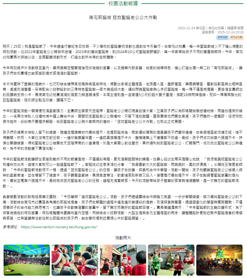 負責策劃活動的教務組長蕭文嘉說:「今日舉辦「搶救聖誕老公公」活動,孩子們透過團結合作與腦力激盪,一步步解開線索,努力尋找聖誕老公公的下落。活動結合南屯市幼園區各角落的耶誕城燈會,孩子們在解題的過程中邊走邊欣賞繽紛的燈飾,充滿探索與驚喜。透過遊戲化的學習與實際體驗,不僅培養孩子的合作能力與思考力,也讓孩子在歡樂溫馨的氛圍中,留下難忘而美好的聖誕節回憶。」園長陳議濃表示:「今年聖誕節的主軸改變形式,為了保留夜晚般的特別氛圍,特別將整體佈置轉向室內空間。同時結合小班群活動、大型主燈與多元主題燈區的概念,讓整體設計更貼近縣市聖誕燈會的規模與感受,也希望讓無法前往新北耶誕城的孩子們,能在學校裡就近實現心中的聖誕願望。」
