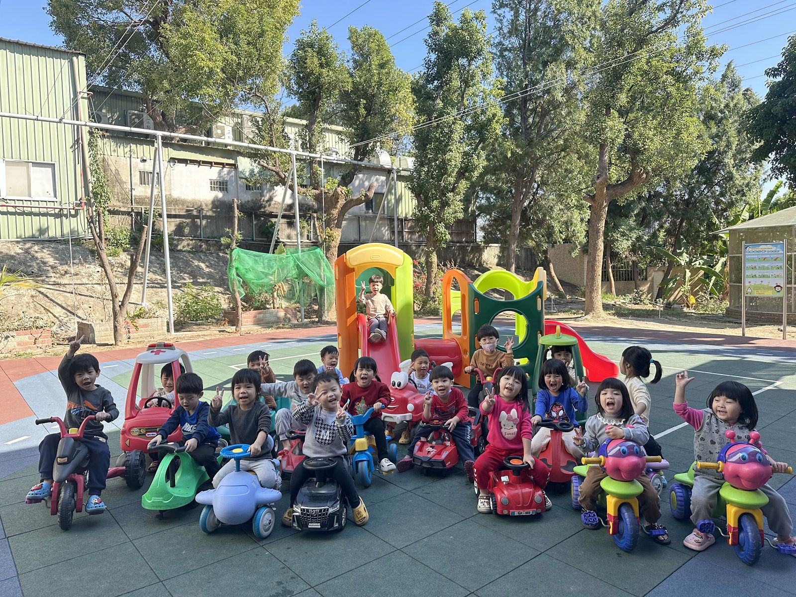 完成腳踏車擦拭後,接著便是大型遊具的清潔工作。孩子們懂得掌握重點,特別加強擦拭身體容易接觸的地方,如滑梯、平台、門邊等,就連通道也沒有放過,做起事來儼然像小小工作人員般有條不紊。遊具擦拭完成後,先暫時放置讓其自然風乾,接下來便進入搬運階段。孩子們各自騎上自己親手擦拭乾淨的腳踏車,一字排開、列隊前進,有秩序地騎回室內放置;同時,大家也齊心協力,一起將大型遊具推進室內軟墊區,順利完成這次任務。