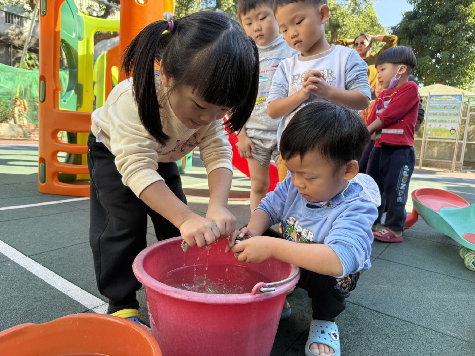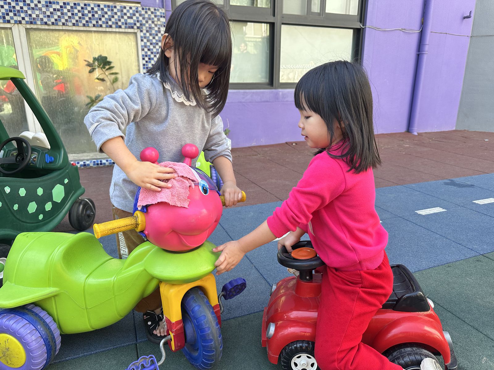 對水獺班而言,第一次出任務就能漂亮完成,大家都覺得既有趣又充滿成就感,還紛紛表示下次還想再出任務。幼生楊詠晴開心地說:「我把車子擦得很亮,大家都喜歡。」幼生官筑旻也自豪地表示:「全班一起推溜滑梯,我有很出力,所以就可以進到屋子裡面。」王雅雯老師說:「今天是水獺班寶貝第一次進行愛校服務。活動前仔細聆聽,要怎麼進行任務呢?接著孩子把溼的抹布擰乾,再把遊具擦呀擦!一輛輛車子,被孩子擦乾淨了。過程中,孩子不僅用到小肌肉,還展現團隊合作的精神,很快的完成這項任務。當孩子把擦好的車子,「開到指定的地點」,孩子的臉上充滿了成就感。今天的活動是一段豐富又有意義的學習歷程唷!」林奕瑄老師說:「今天水獺班的寶貝們一起來幫忙把車子跟溜滑梯擦乾淨,平時大家因為有在洗抹布及擦桌子的經驗,所以這項任務對寶貝們來說可是相當得心應手呢!而每個人認真的拿著抹布將每一處的灰塵都擦拭乾淨,也非常值得稱讚與鼓勵!謝謝寶貝們的幫忙,讓車子跟溜滑梯變得乾淨溜溜,之後大家就可以繼續開心使用囉!」