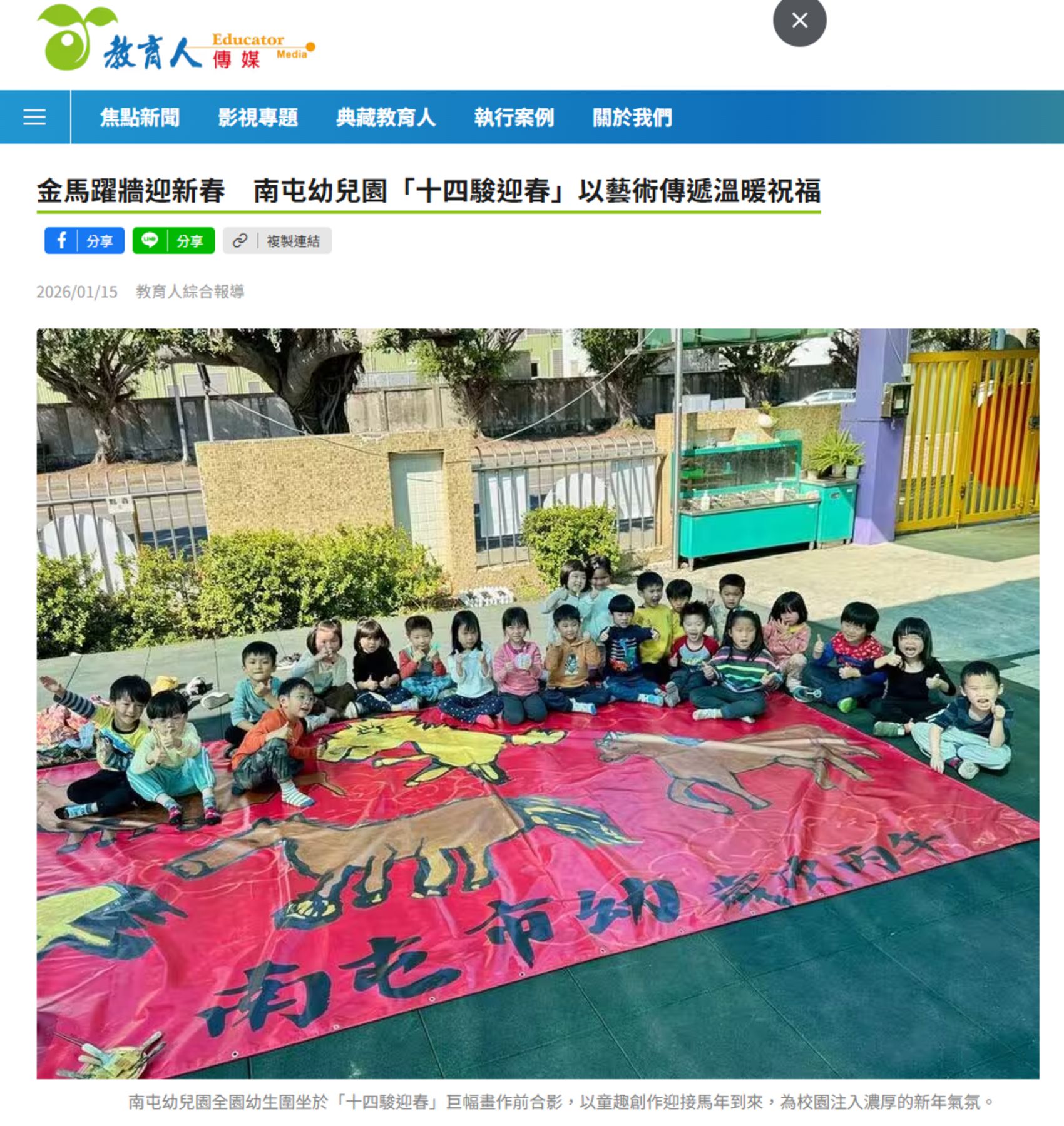 金馬躍牆迎新春 南屯幼兒園「十四駿迎春」以藝術傳遞溫暖祝福 賀! 本園圍爐活動榮登教育人傳媒刊登 「金馬躍牆迎新春 南屯幼兒園「十四駿迎春」以藝術傳遞溫暖祝福」 全體師生家長同賀 https://is.gd/gP43al