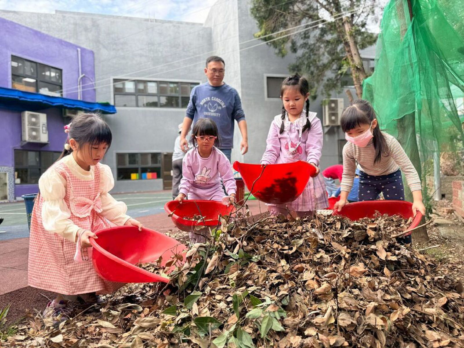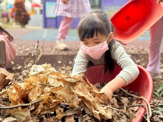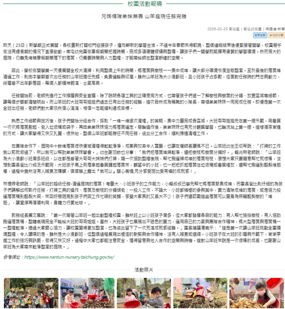 教務組長蕭文嘉說:「第一次帶著山羊班一起出動整理校園,雖然班上以小班孩子居多,但大家都發揮各自的能力:有人幫忙撿拾樹枝,有人協助搬運落葉桶,整體表現完全不輸給大班的哥哥姐姐。當然,大班孩子也展現出不遜色的實力,運用自己的力氣與團隊合作精神,將大型落葉與落葉桶一一整理乾淨。透過大家齊心協力,讓校園變得更加整潔,也為彼此留下了一次充滿成就感經驗。」園長陳議濃表示:「這是第一次讓山羊班挑戰全園環境整理,令人讚嘆的是,雖然是大小混齡班,但整個過程展現出極佳的默契與合作精神,沒有人喊累或退縮。小班孩子在大班的引導與示範下,漸漸掌握工作的技巧與訣竅,做得又快又好。過程中大家也都能注意安全,懂得留意與他人合作的空間與時機。這對山羊班來說是一次很棒的成長,也謝謝山羊班為大家帶來乾淨整潔的庭院。」