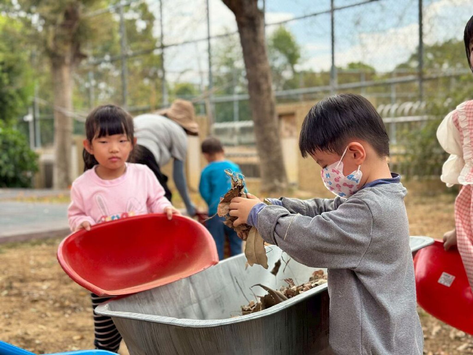 熟悉工作細節與技巧後,孩子們開始分組合作,採取「一堆一堆逐次清理」的策略,集中力量完成各區域。大班哥哥姐姐先在第一線示範,用畚箕一次次將落葉剷起,倒入垃圾桶或袋子,再由弟弟妹妹協力將落葉運走。幾輪操作後,弟弟妹妹也有充分觀察學習,也輪流站上第一線。這樣循序漸進的方式,讓大家學得又快又扎實,很快地,整個山羊班都能勝任不同任務,彼此分工合作,順利推進清理工作。
