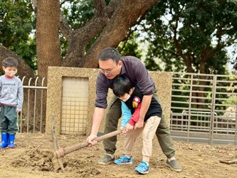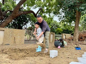 李佩珊老師說:「在孩子們小班時有製作窯土的相關經驗,因此這次園長爸爸帶著我們使用三種不同的工具挖土,幼兒能在老師的引導下選擇自己想使用的工具,幼兒們很興奮能使用到大人的十字鎬、鋤頭、鏟子,也能在園長爸爸的陪伴下使用工具,將土裝到美植袋裡。接著用小工具和雙手將土捏碎,以及加水變成泥巴水,最後把多餘的水壓出來,接下來就是等待太陽把土曬乾!過程中幼兒很專注的聆聽工作的方式並且執行,孩子們都越來越長大了呢!就讓我們一起期待控窯的活動到來吧~」園長陳議濃表示:「這次做土塊的活動,對長時間累積食農經驗的山羌班來說並不困難,因此我們更進一步讓孩子體驗不同挖土工具的特性與使用時機。讓孩子明白,一件事情的完成,需要善用工具與妥善規劃步驟。這次山羌班也順利完成任務,不僅挖好了土,連烘窯的洞也一併準備完成。期待一週後這些壓製的窯土都能順利成形,讓孩子們盡情享受烘窯的樂趣。」