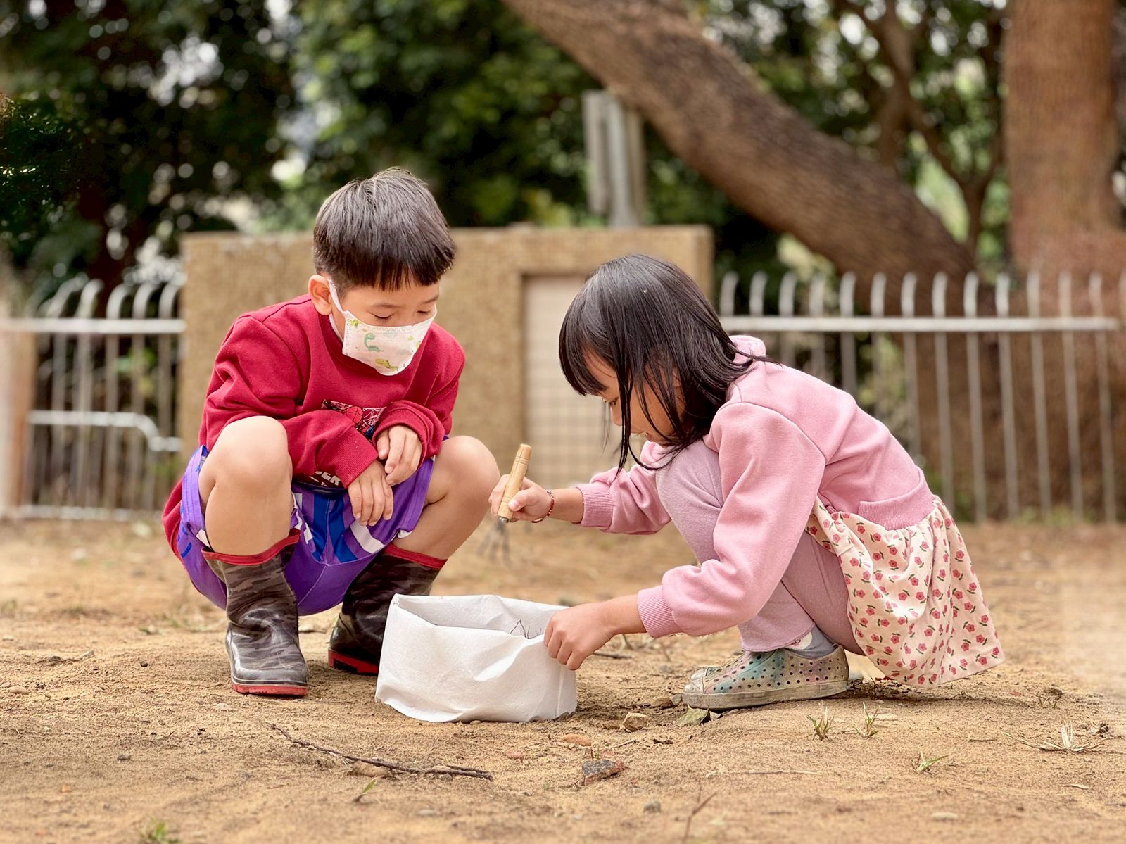 孩子們對一週後的成果充滿期待,也默默希望接下來的日子裡不要下雨,好讓土塊順利乾燥,成為烘窯時最重要的材料。山羌班幼生盧非凡說:「我用力用鎬子挖土,這樣大家都可以更容易挖出土。」幼生謝蕎衣也分享:「最後要用力壓袋子,這樣水才會跑出來、跑得乾淨。」陳亮云老師說:「當山羌班的孩子知道下週準備烤地瓜時,孩子們都很期待,也提出了烤地瓜的方式,因為在烤地瓜之前,需要先準備蓋窯的土塊,所以今天大家一起幫忙,將土挖進袋子裡,加入水之後變成泥巴的樣子,等待太陽曬乾後,就可以準備蓋烤地瓜的房子了,這是烤地瓜前很重要的一環,也是為接下來的活動盡一份心力呢!」
