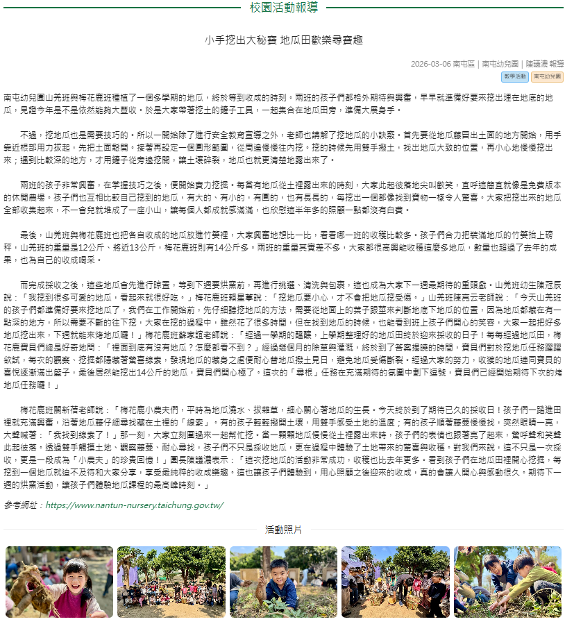 梅花鹿班關新蓓老師說:「梅花鹿小農夫們,平時為地瓜澆水、拔雜草,細心關心著地瓜的生長。今天終於到了期待已久的採收日!孩子們一踏進田裡就充滿興奮,沿著地瓜藤仔細尋找藏在土裡的「線索」。有的孩子輕輕撥開土壤,用雙手感受土地的溫度;有的孩子順著藤蔓慢慢找,突然眼睛一亮,大聲喊著:「我找到線索了!」那一刻,大家立刻圍過來一起幫忙挖。當一顆顆地瓜慢慢從土裡露出來時,孩子們的表情也跟著亮了起來,驚呼聲和笑聲此起彼落。透過雙手觸摸土地、觀察藤蔓、耐心尋找,孩子們不只是採收地瓜,更在過程中體驗了土地帶來的驚喜與收穫。對我們來說,這不只是一次採收,更是一段成為「小農夫」的珍貴回憶!」園長陳議濃表示:「這次挖地瓜的活動非常成功,收穫也比去年更多。看到孩子們在地瓜田裡開心挖掘,每挖到一個地瓜就迫不及待和大家分享,享受最純粹的收成樂趣。這也讓孩子們體驗到,用心照顧之後迎來的收成,真的會讓人開心與感動很久。期待下一週的烘窯活動,讓孩子們體驗地瓜課程的最高峰時刻。」