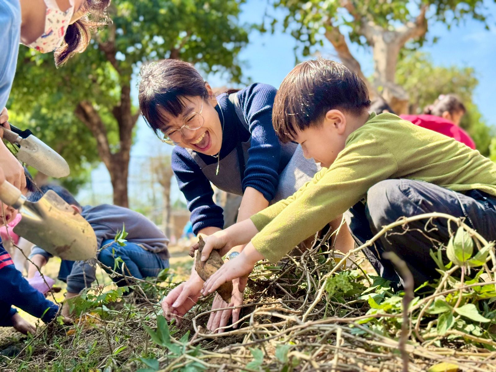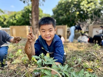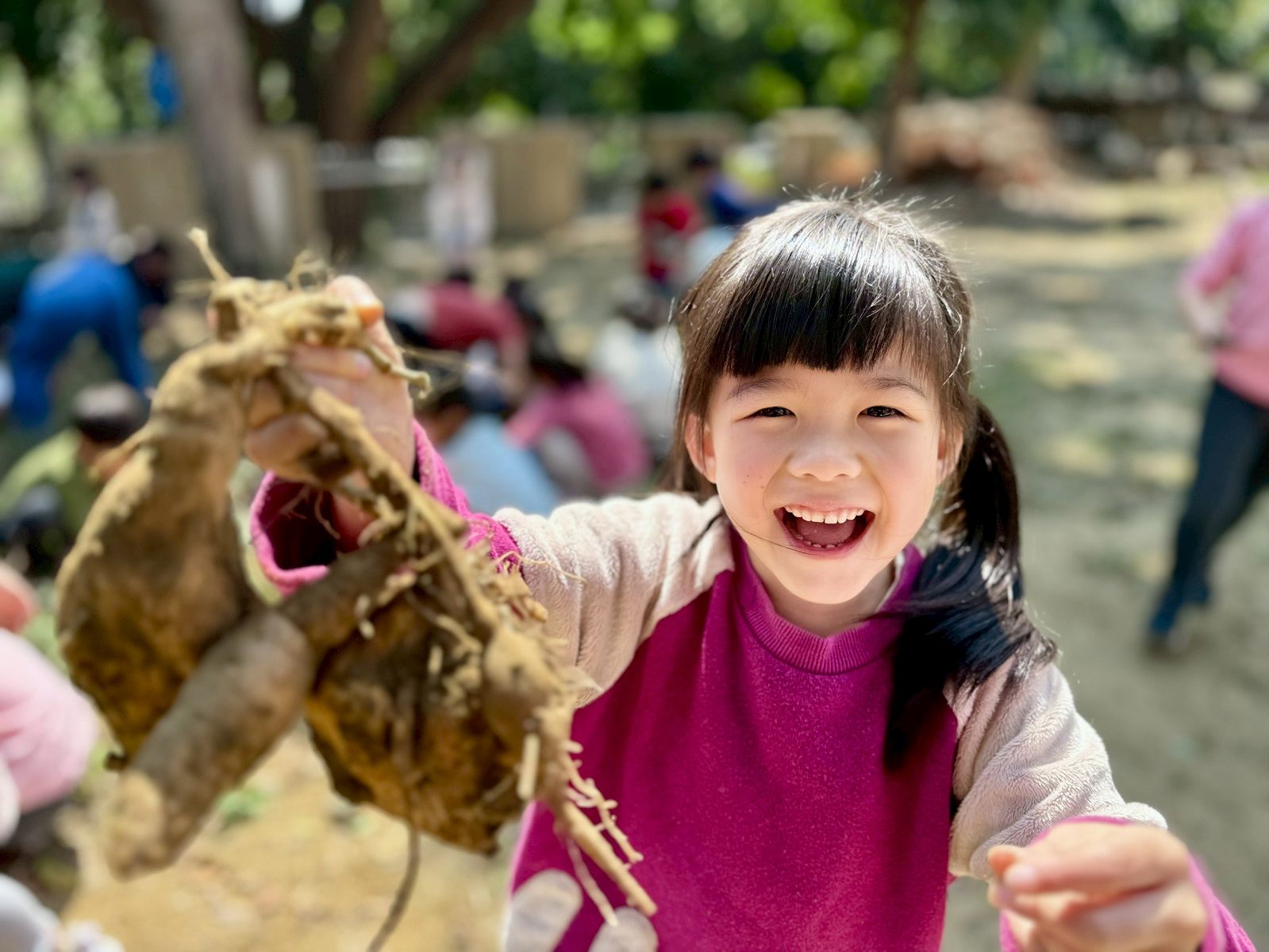 兩班的孩子非常興奮,在掌握技巧之後,便開始賣力挖掘。每當有地瓜從土裡露出來的時刻,大家此起彼落地尖叫歡笑,直呼這簡直就像是免費版本的休閒農場。孩子們也互相比較自己挖到的地瓜,有大的、有小的,有圓的,也有長長的,每挖出一個都像找到寶物一樣令人驚喜。大家把挖出來的地瓜全部收集起來,不一會兒就堆成了一座小山,讓每個人都成就感滿滿,也欣慰這半年多的照顧一點都沒有白費。