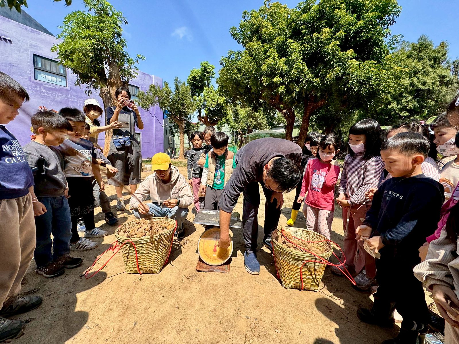 而完成採收之後,這些地瓜會先進行晾置,等到下週要烘窯前,再進行挑選、清洗與包裹,這也成為大家下一週最期待的重頭戲。山羌班幼生陳冠辰說:「我挖到很多可愛的地瓜,看起來就很好吃。」梅花鹿班賴星葶說:「挖地瓜要小心,才不會把地瓜挖受傷。」山羌班陳亮云老師說:「今天山羌班的孩子們都準備好要來挖地瓜了,我們在工作開始前,先仔細聽挖地瓜的方法,需要從地面上的葉子跟莖來判斷地底下地瓜的位置,因為地瓜都藏在有一點深的地方,所以需要不斷的往下挖,大家在挖的過程中,雖然花了很多時間,但在找到地瓜的時候,也能看到班上孩子們開心的笑容,大家一起把好多地瓜挖出來,下週就能來烤地瓜囉!」梅花鹿班蘇家誼老師說:「經過一學期的醞釀,上學期整理好的地瓜田終於迎來採收的日子!每每經過地瓜田,梅花鹿寶貝們總是好奇地問:「裡面到底有沒有地瓜?怎麼都看不到?」經過幾個月的除草與灌溉,終於到了答案揭曉的時間,寶貝們對於挖地瓜任務躍躍欲試,每次的觀察、挖掘都隱藏著驚喜線索,發現地瓜的藏身之處便耐心替地瓜撥土見日,避免地瓜受傷斷裂。經過大家的努力,收獲的地瓜連同寶貝的喜悅逐漸滿出籃子,最後居然能挖出14公斤的地瓜,寶貝們開心極了。這次的「尋根」任務在充滿期待的氛圍中劃下逗號,寶貝們已經開始期待下次的烤地瓜任務囉!」