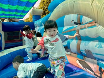 松鼠班徐素雯老師說:「一年一次的氣墊城堡遊戲日,也是為了慶祝兒童節特別準備的活動!松鼠班一早8:20就進場,連平常9點才到的孩子,今天也都提早到校,充滿期待地準備參與。孩子們在三座氣墊城堡裡盡情玩耍,也能注意安全、保護自己,老師只需稍加提醒就能做到,真的很棒!看著大家臉上滿滿的笑容,這份純真的快樂,就是最棒的兒童節禮物。」水獺班王雅雯老師說:「今天一早入園,孩子們看見廣場設置的氣墊樂園,眼神充滿著期待與興奮的心情,迫不及待的想要趕快去玩。活動開始前,老師除了叮嚀安全的規則,也帶領孩子做暖身操,確保活動的安全。當輪到我們進到歡樂氣墊樂園時,孩子們盡情的玩耍,釋放活力;臉上展現燦爛的笑容,還有此起彼落的歡笑聲,從中可以感受到滿滿的快樂。透過此次活動,不僅讓孩子活動身體,也培養遵守規則與等待輪流的能力,讚唷!」