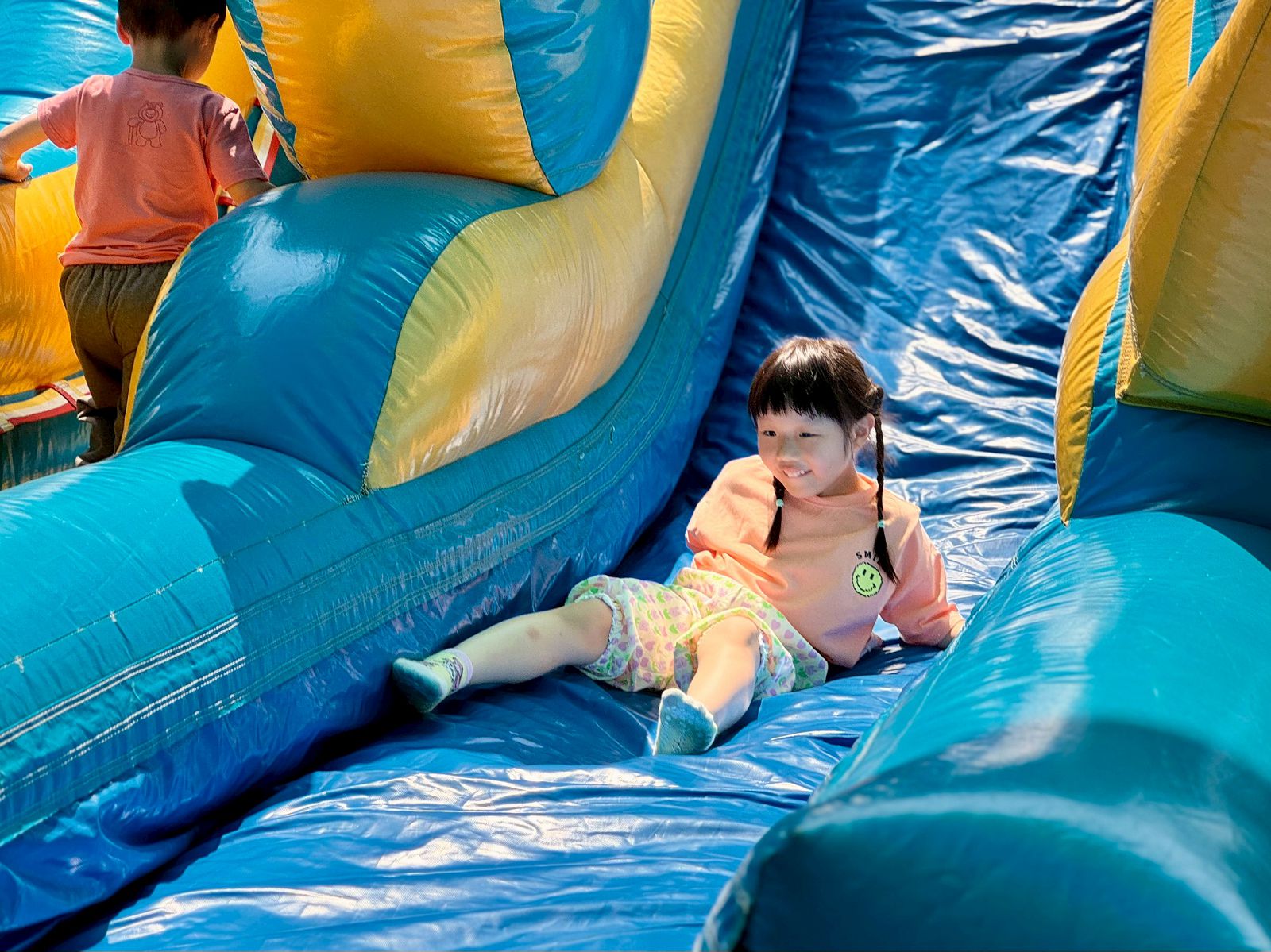今年共有三座大型充氣遊具登場,每一座不僅兼顧遊玩趣味與適齡設計,在安全性上更是毫不馬虎。一大早便完成設置,並反覆檢視各項安全防護措施,讓整個場地既安全又安心。位於天空階梯的,是擁有雙滑道的「小小兵雙滑梯」。孩子們爬上高高的平台,俯瞰四周,既新鮮又刺激;當準備就緒、順勢滑下的瞬間,那種飛快俯衝的快感,讓現場尖叫聲此起彼落,刺激指數瞬間爆表。