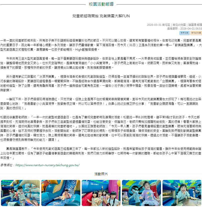 一年一度的兒童節即將來到,所有孩子無不引頸期盼這個專屬於他們的節日。不只可以開心放假,還常常有驚喜禮物相伴。在南屯幼兒園,兒童節更是園內的重要日子,因此每一年都精心規劃一系列活動,讓孩子們盡情歡慶、留下滿滿回憶。而今天(31日)正是系列活動的第一場—「歡樂氣墊樂園」,大型充氣遊具正式進駐校園,準備讓每一位孩子都能暢玩、High翻整個操場。