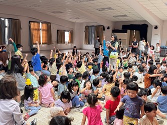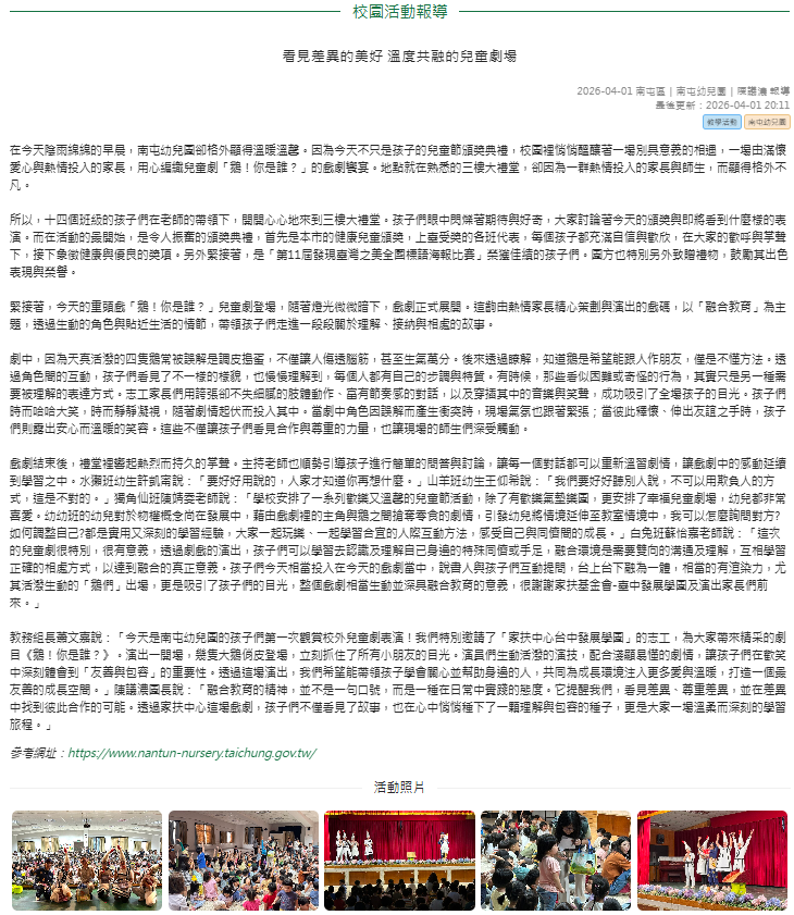 教務組長蕭文嘉說:「今天是南屯幼兒園的孩子們第一次觀賞校外兒童劇表演!我們特別邀請了「家扶中心台中發展學園」的志工,為大家帶來精采的劇目《鵝!你是誰?》。演出一開場,幾隻大鵝俏皮登場,立刻抓住了所有小朋友的目光。演員們生動活潑的演技,配合淺顯易懂的劇情,讓孩子們在歡笑中深刻體會到「友善與包容」的重要性。透過這場演出,我們希望能帶領孩子學會關心並幫助身邊的人,共同為成長環境注入更多愛與溫暖,打造一個最友善的成長空間。」陳議濃園長說:「融合教育的精神,並不是一句口號,而是一種在日常中實踐的態度。它提醒我們,看見差異、尊重差異,並在差異中找到彼此合作的可能。透過家扶中心這場戲劇,孩子們不僅看見了故事,也在心中悄悄種下了一顆理解與包容的種子,更是大家一場溫柔而深刻的學習旅程。」