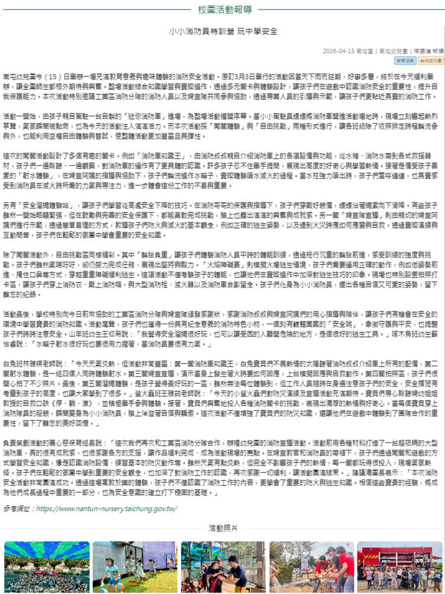 南屯幼兒園今(15)日舉辦一場充滿教育意義與趣味體驗的消防安全活動。原訂33日舉行的活動因當天下雨而延期,好事多磨,終於在今天順利舉辦,讓全園師生都格外期待與興奮。整場活動結合知識學習與實際操作,透過多元關卡與體驗設計,讓孩子們在遊戲中認識消防安全的重要性,提升自我保護能力。本次活動特別邀請工業區消防分隊的消防人員以及婦宣隊共同參與協助,透過專業人員的引導與示範,讓孩子們更貼近真實的消防工作。