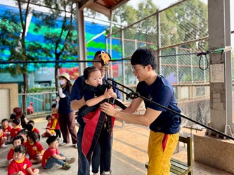 白兔班林雅琪老師說:「今天天氣炎熱,但活動非常豐富:第一關消防車知識王,白兔寶貝們不畏熱情的太陽聽著消防叔叔介紹車上所有的配備,第二關射水體驗,是一組四個人同時體驗射水。第三關婦宣宣導,演示當身上發生著火時要如何因應,上台模擬因應與自救動作。第四關拍照區,孩子們很開心拍了不少照片。最後,第五關溜繩體驗,是孩子覺得最好玩的一區,雖然無法每位體驗到,但工作人員隨時在身邊注意孩子們的安全,安全措施有考量到孩子的高度,也讓大家學到了很多。」螢火蟲班王雅茹老師說:「今天的小螢火蟲們對防災演練及宣導活動充滿期待。寶貝們專心聆聽婦幼姐姐教授的自救口訣《停、躺、滾》,並積極舉手參與體驗。接著,寶貝們興奮地投入各種消防關卡的挑戰,表現出濃厚的熱情與好奇心。當每個寶貝穿上消防隊員的服裝,瞬間變身為小小消防員,臉上洋溢著自信與驕傲。這次活動不僅增強了寶貝們的防災知識,還讓他們在遊戲中體驗到了團隊合作的重要性,留下了難忘的美好回憶。」