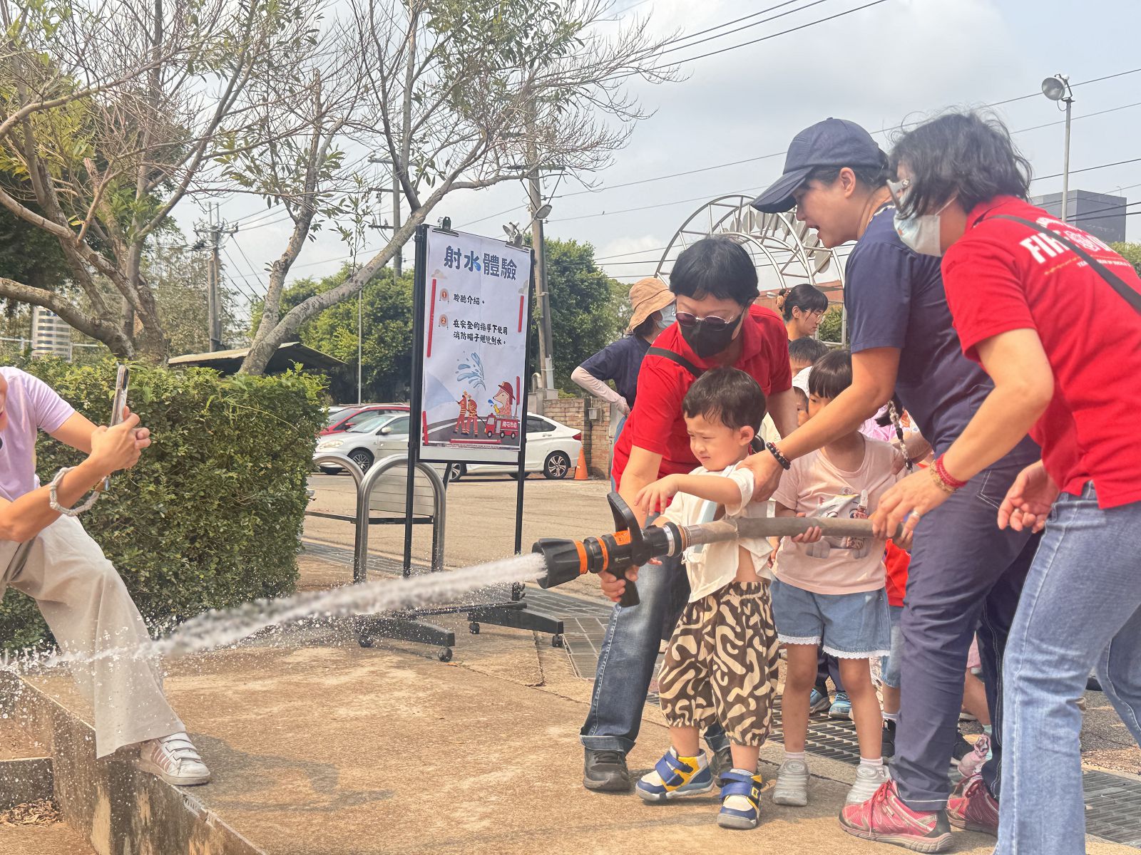 這次的闖關活動設計了多個有趣的關卡。例如「消防車知識王」,由消防叔叔親自介紹消防車上的各項設備與功能,從水箱、消防水帶到各式救援器材,孩子們一邊聆聽、一邊觀察,對消防車的運作有了更具體的認識。許多孩子忍不住舉手提問,展現出高度的好奇心與學習熱情。接著是備受孩子喜愛的「射水體驗」,在婦宣阿姨的指導與協助下,孩子們輪流操作水瞄子,實際體驗噴水滅火的過程。當水柱強力噴出時,孩子們驚呼連連,也真實感受到消防員在滅火時所需的力氣與專注力,進一步體會這份工作的不易與重要。